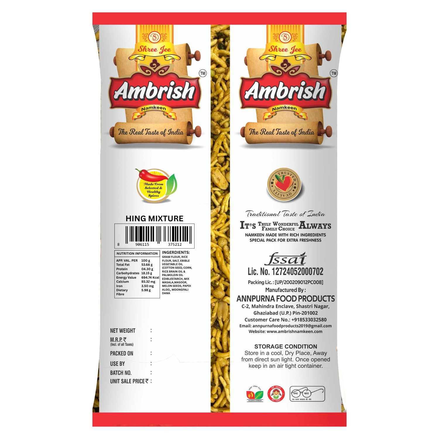 Buy Hing Mixture online from Ambrish Namkeen and experience a unique blend of flavors with every bite. Our Namkeen is a savory and spicy snack made with high-quality ingredients, offering the perfect balance of crunch and heat. It’s an ideal choice for those seeking a healthy snack that’s light yet satisfying.